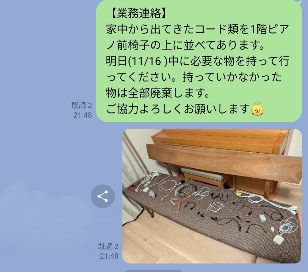 明日(11/16)中に必要な物を持って行ってください。持っていかなかった物は全部廃棄します。