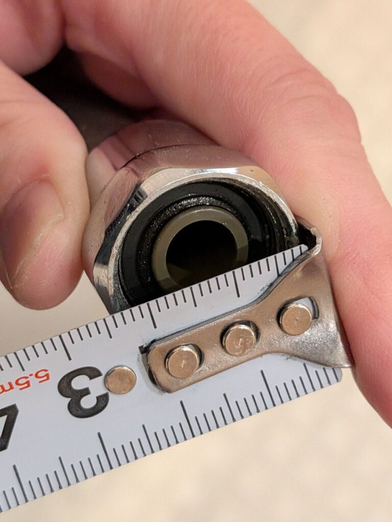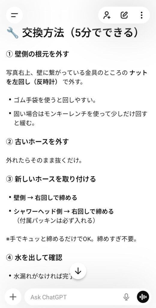 ChatGPTに言われたとおりにモンキーで根元のナットをひねり外し、シャワーの径を測ります。