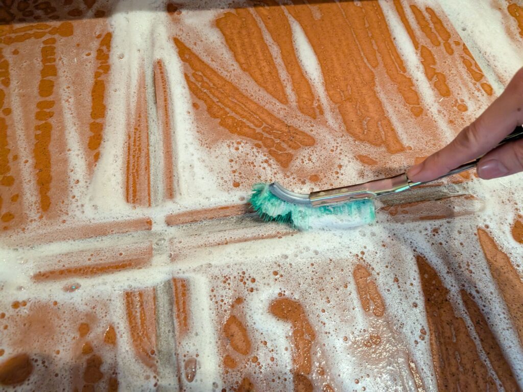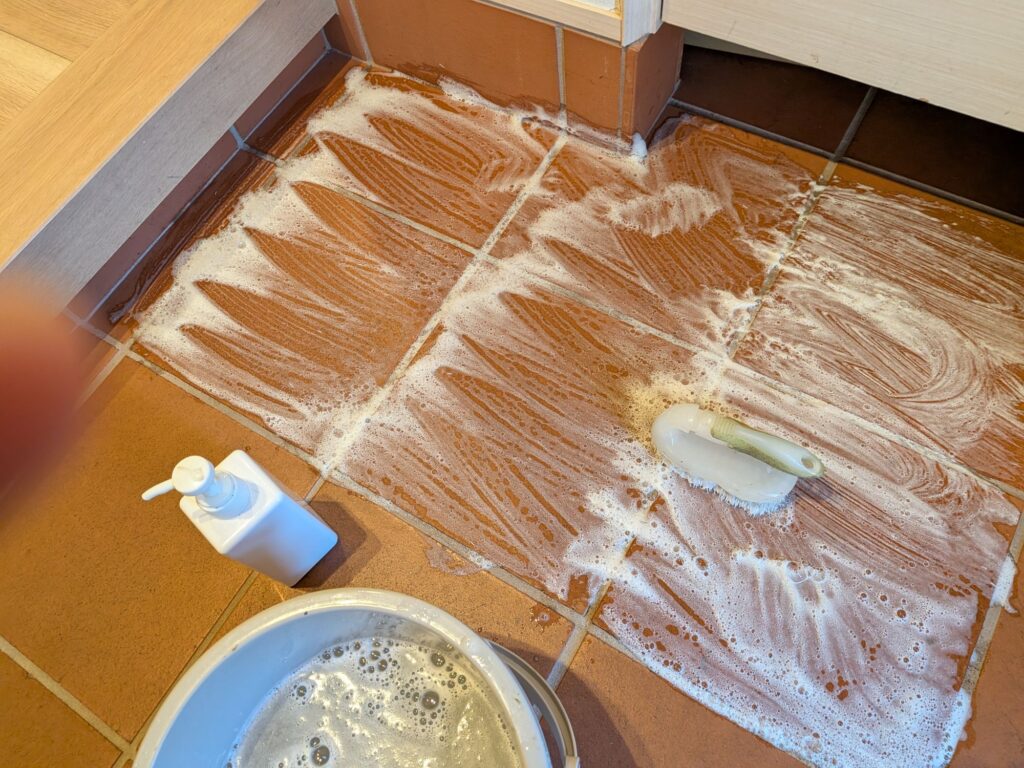 ブラシに水を含ませ、中性洗剤をたらして大胆にゴシゴシと擦っていきます。